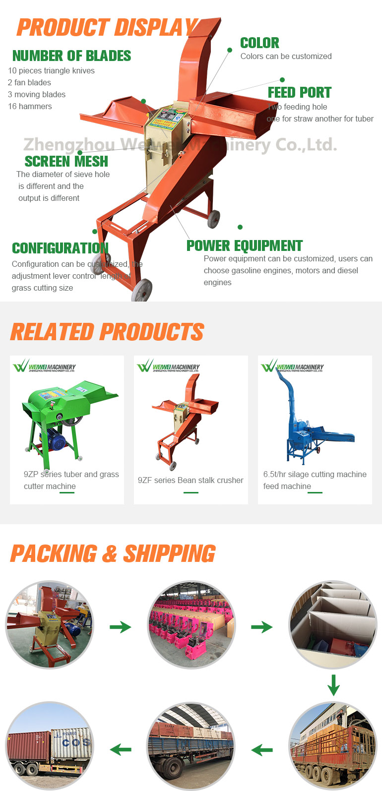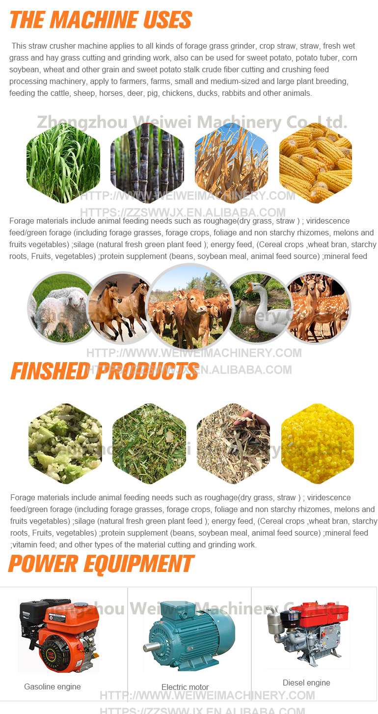 This straw crusher machine applies to all kinds of forage grass grinder, crop straw, straw, fresh wet grass and hay grass cutting and grinding work, also can be used for sweet potato, potato tuber, corn soybean, wheat and other grain and sweet potato stalk crude fiber cutting and crushing feed processing machinery, apply to farmers, farms, small and medium-sized and large plant breeding, feeding the cattle, sheep, horses, deer, pig, chickens, ducks, rabbits and other animals.